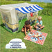 - INCLUDES: Bluey Tent Fabric Cover, Fort Poles and Connectors, Tent Stakes, Water Resistant Base, Hanging Lights, Tent Carrying Case, Reversible Game Mat for tic tac toe and picnic set, 10 Tic Tac Toe and Bean Bag Toss Pieces, Awning Toss Game, Bluey and Bingo Puppets, Pretend Play Smores Set.